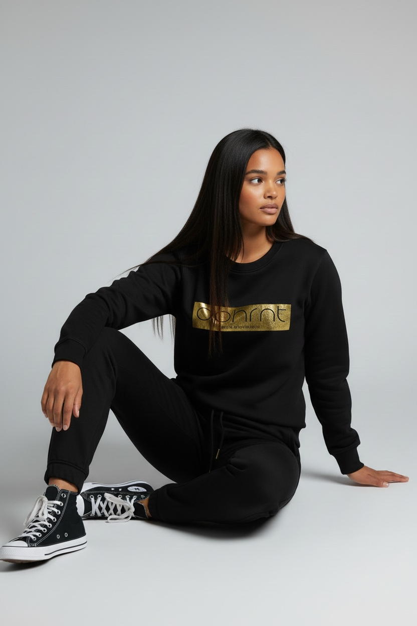 This sophisticated, stylish "DPHRNT" Gold Foil Pullover Jogger Set is made from a soft, smooth and comfortable cotton fabric. It features an eye-catching gold foil design and warm cotton fleece joggers - making it perfect for stylish everyday wear.